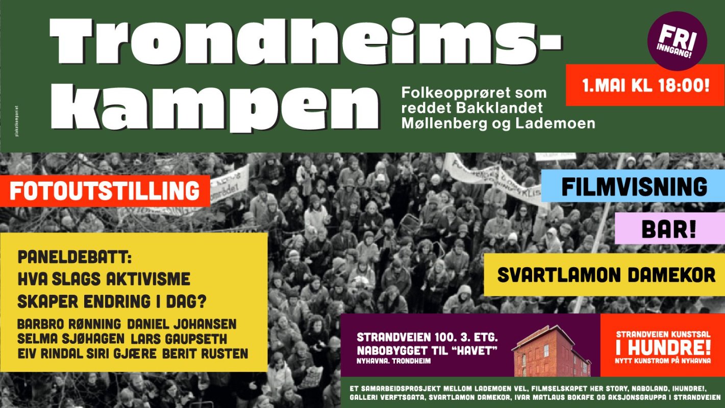 Her vil søttitallets aktivisme i filmen TRONDHEIMSKAMPEN møte dagens kamp for Strandveien 23 og kulturmiljøene på Nyhavna, gjennom film, paneldebatt, appeller og kunstneriske innslag.