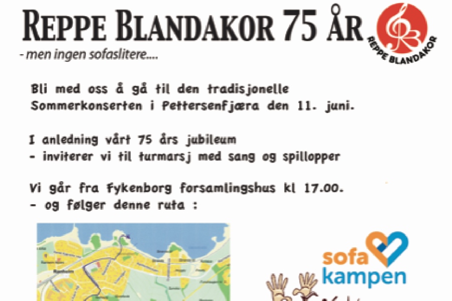 I anledning vårt 75-års jubileum skal vi tirsdag 11.juni gå i tog fra Fykenborg med mål for den årlige sommerkonserten i Pettersenfjæra.